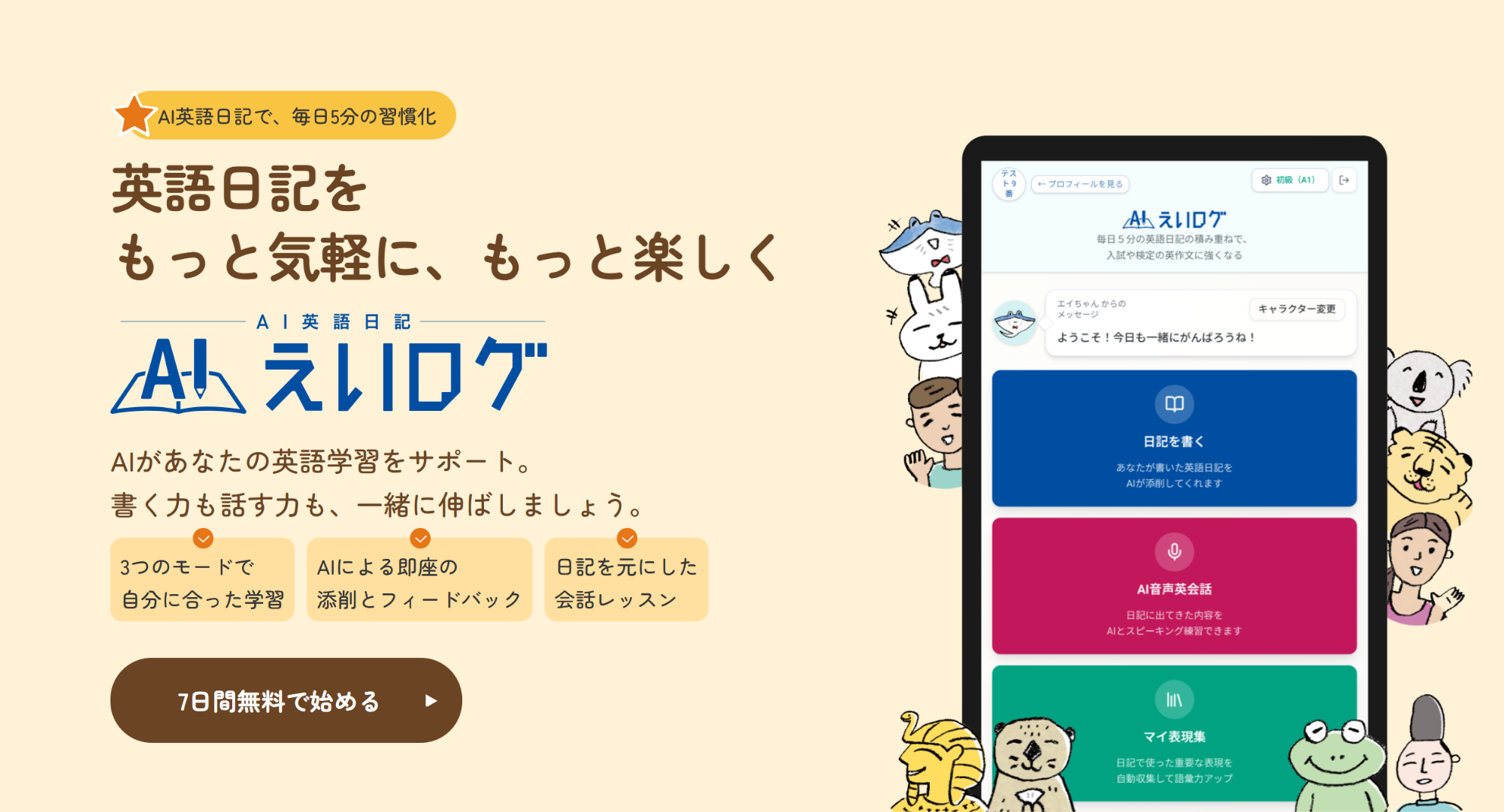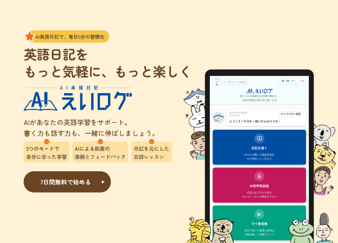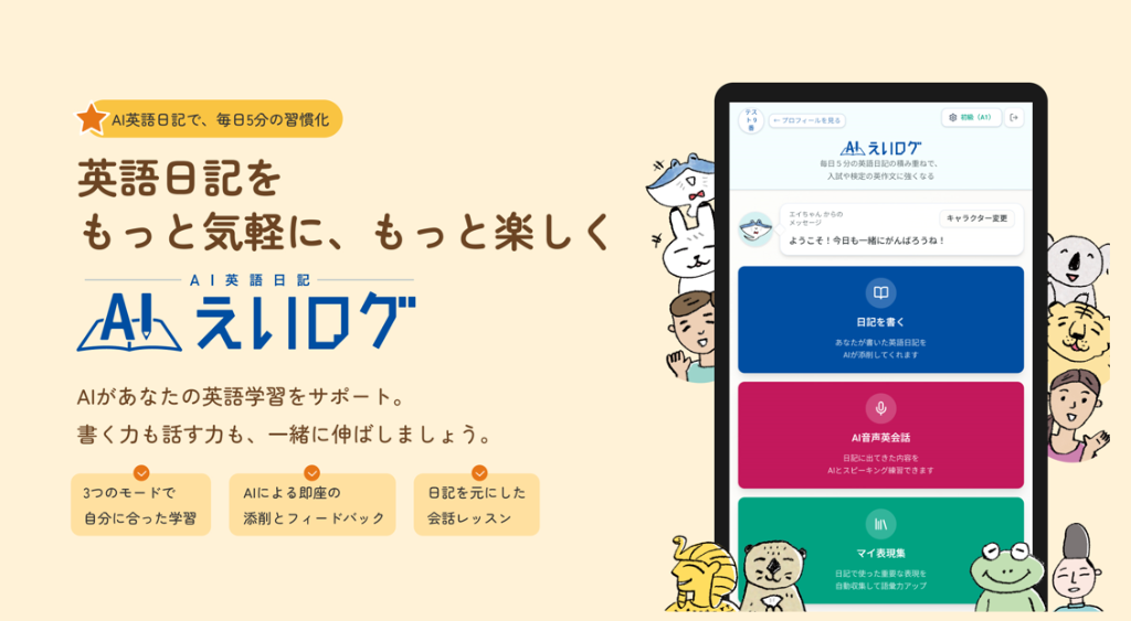 「AI英語日記」えいログを追加「英語学習アプリ レシピー」も自由に使える