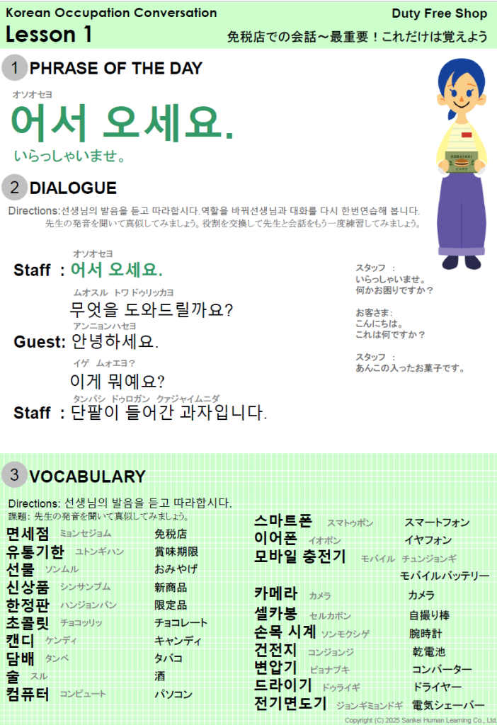 これまで産経オンライン英会話Plusでは、オンライン英会話の中で、日本を訪れる外国人のお客様に英語で応対する様々な職業の方向けに「職業別英会話」テキストを提供してきました。このノウハウを活かし、今回「免税店 韓国語」のテキストをリリースいたします。