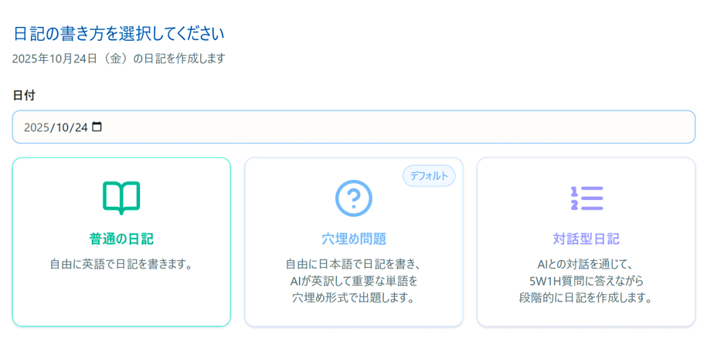 生徒は、「普通の日記」「穴埋め問題」「対話型日記」の3つの書き方から選んで日記を書くことができます。
