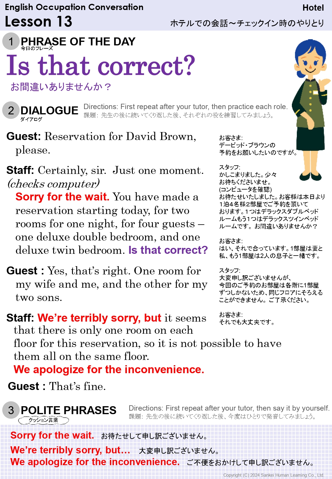 18 | Thank you for calling Sankei Hotel. | 産経ホテルにお電話いただきありがとうございます。 | |